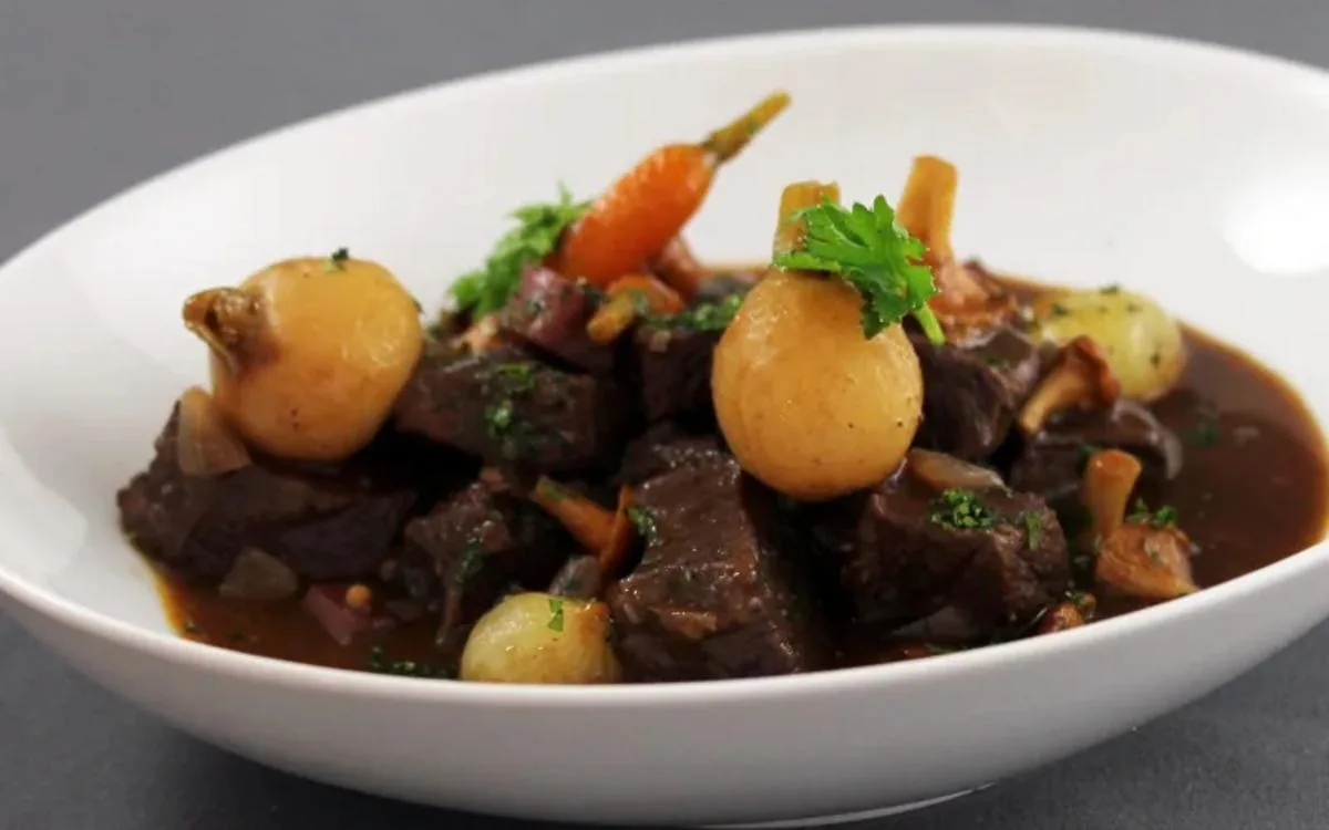 Disposer la viande et les légumes dans un plat de service, napper de sauce et servir bien chaud.