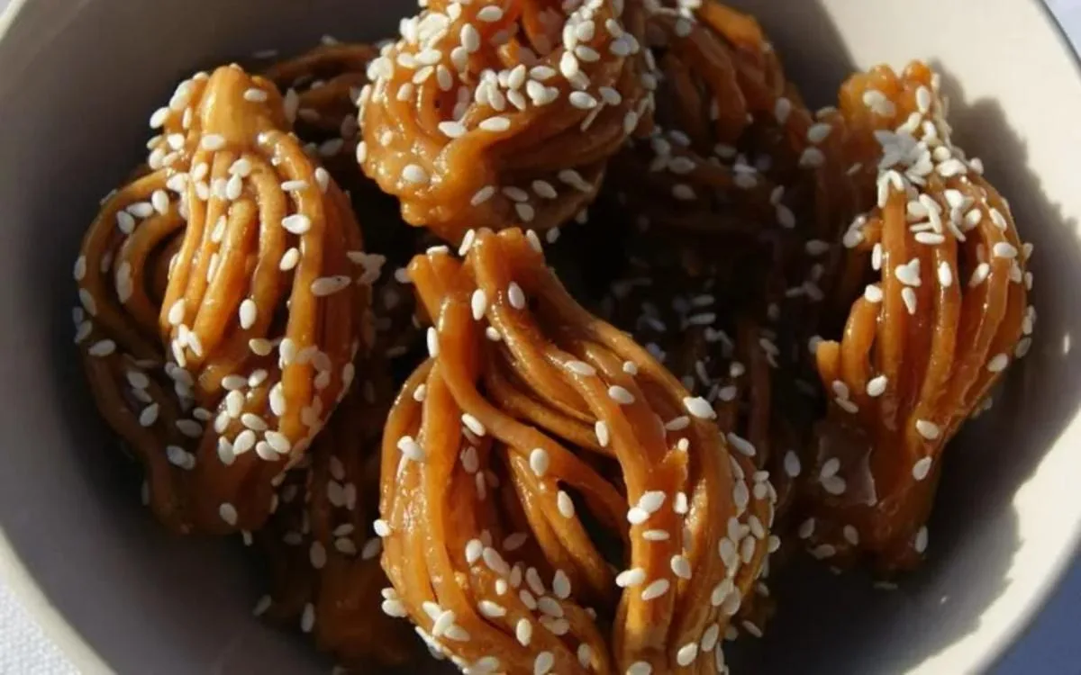 Prendre une dizaine de spaghettis et les pincer ensemble tous les 30 à 40cm. Couper ensuite des petits bandes et les faire frire dans de l’huile à haute température. Une fois les gateaux frits, arroser de miel et saupoudrer de graines de sésames.