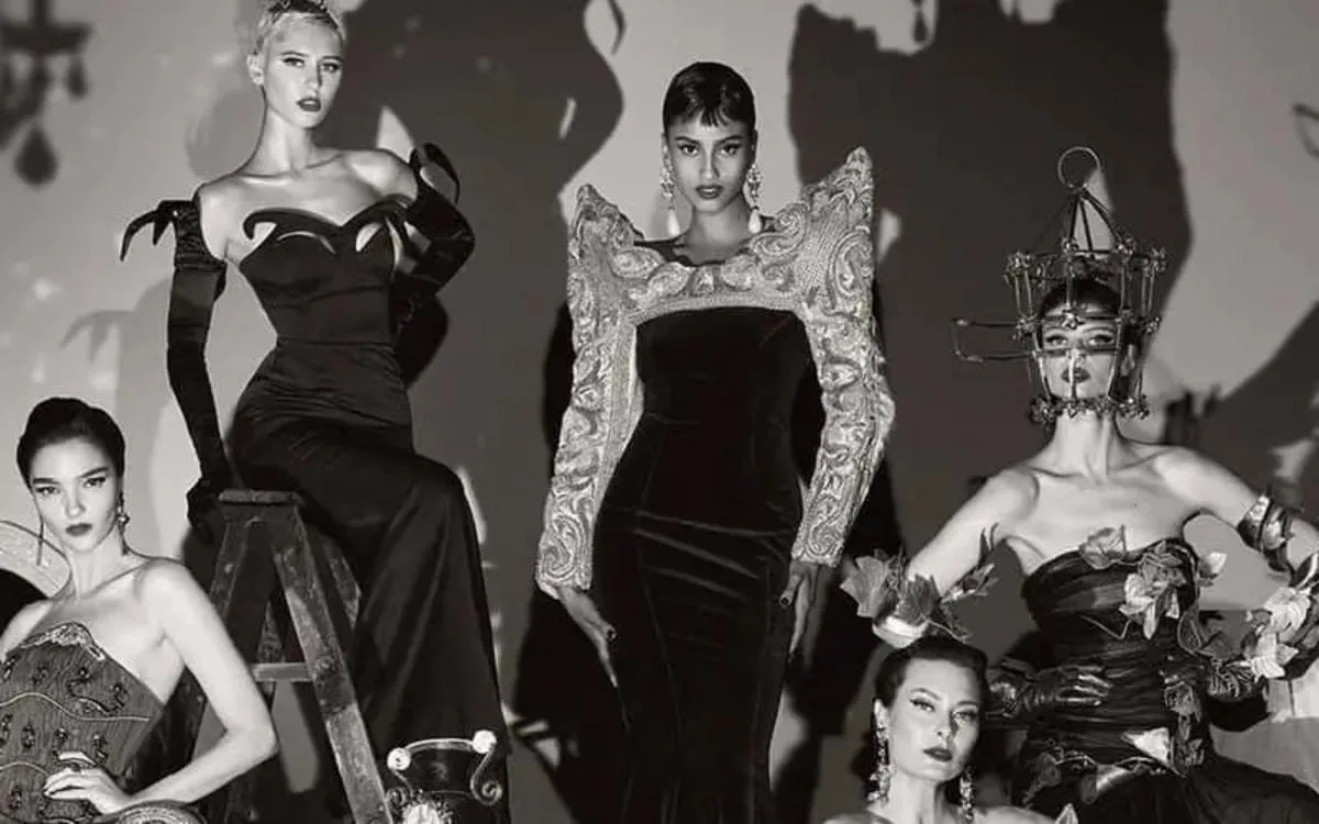 Sur les affiches publicitaires, Hammam porte une pièce mi–longue à manches longues avec un décolleté doré, associée à des boucles d’oreilles. On y voit également des robes sculptées, des coiffes exagérées et des corsets en brocart, le tout créé par la styliste Carlyne Cerf de Dudzeele.