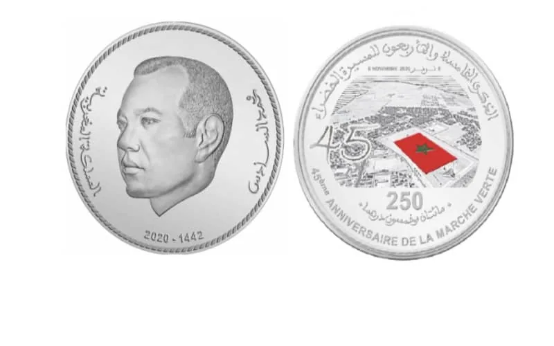 Dans la présentation, la nouvelle pièce révèle à l’envers une effigie du Roi Mohammed VI avec des inscriptions en arabe “Mohammed VI” et “Royaume du Maroc” et avec en bas le millésime 2020-1442. Au revers, la nouvelle pièce montre en haut l’inscription en arabe “45è anniversaire de la Marche Verte” avec sa traduction française en bas, précise le même communiqué.