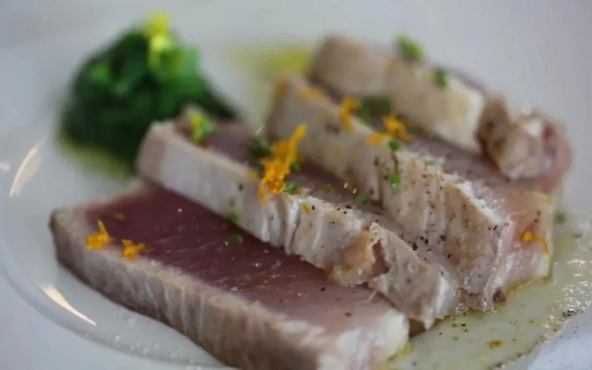 Faites cuire à la vapeur les tranches de thon, disposez-les sur un plat de service, badigeonnez-les de la vinaigrette à l’orange, salez, poivrez et mettez au réfrigérateur.