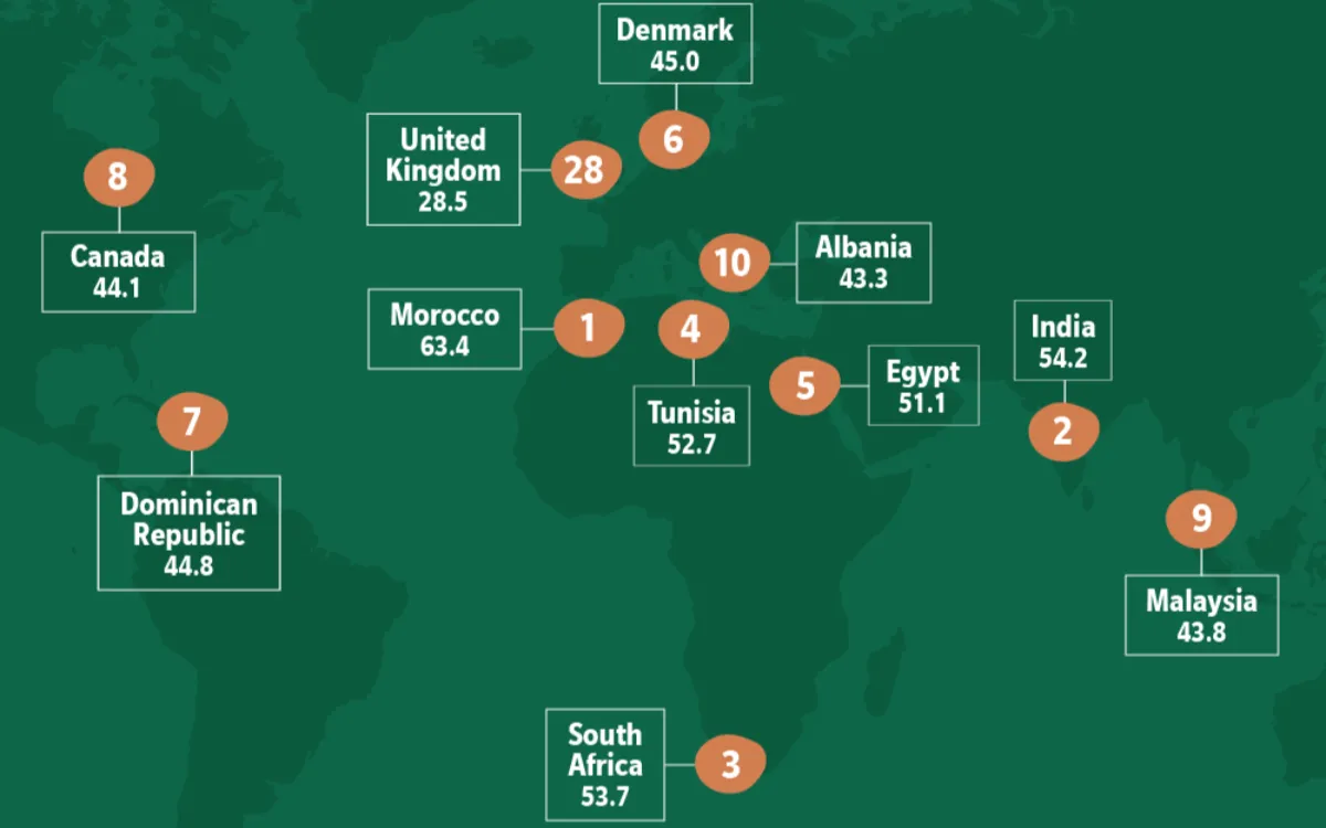 Ce classement met en évidence une nette domination des pays chauds. L’Inde s’empare de la deuxième place, suivie de près par l’Afrique du Sud, la Tunisie et l’Égypte, qui viennent clôturer le top 5. L’Algérie est absente du classement.