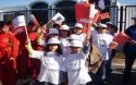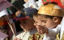 Elles portent de larges chapeaux à pompons multicolores et des robes superposées roses,...